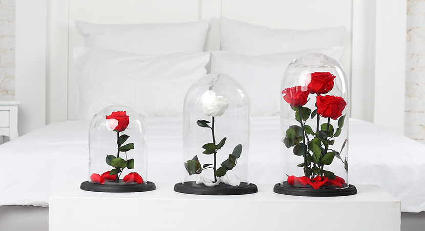 Стабилизированная роза не завянет. На протяжении всего срока, она будет выглядеть так, как будто еще утром она произрастала в благоухающем саду. Цветок не только внешне, но и на ощупь не отличается от свежесрезанного растения. Вы всегда можете открыть колпак и лично убедиться в этом. Неувядающая роза не выгорит и не потускнеет.